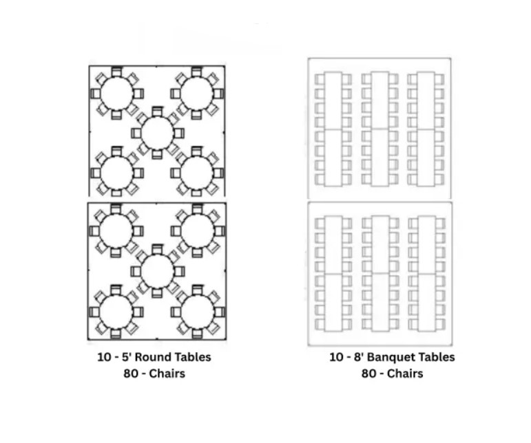 Add more natural light and vertical volume to your next tent rental. The old cross cable peak tents are boring and dark. With our new line of Marquee Tents, more light shines through the gable windows adding a brighter, more vibrant experience for your guests. Tent seats 60-90 guests comfortably depending on table arrangement.